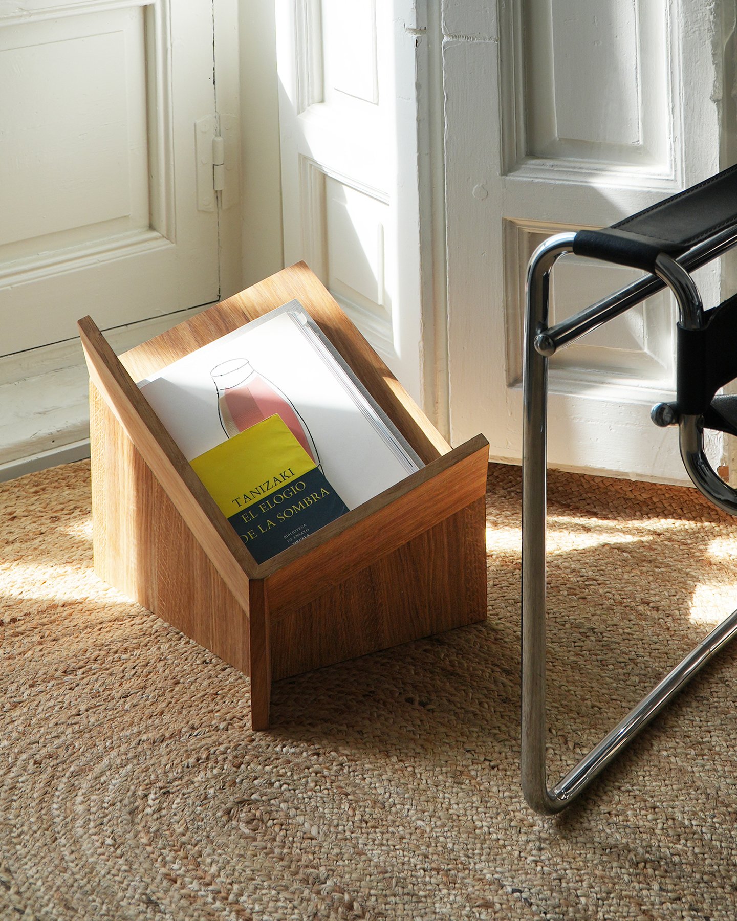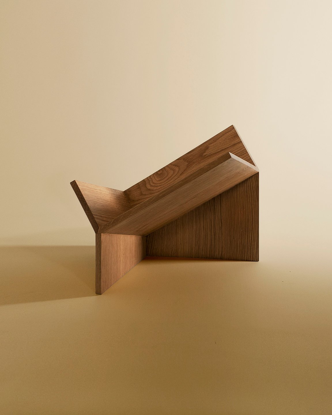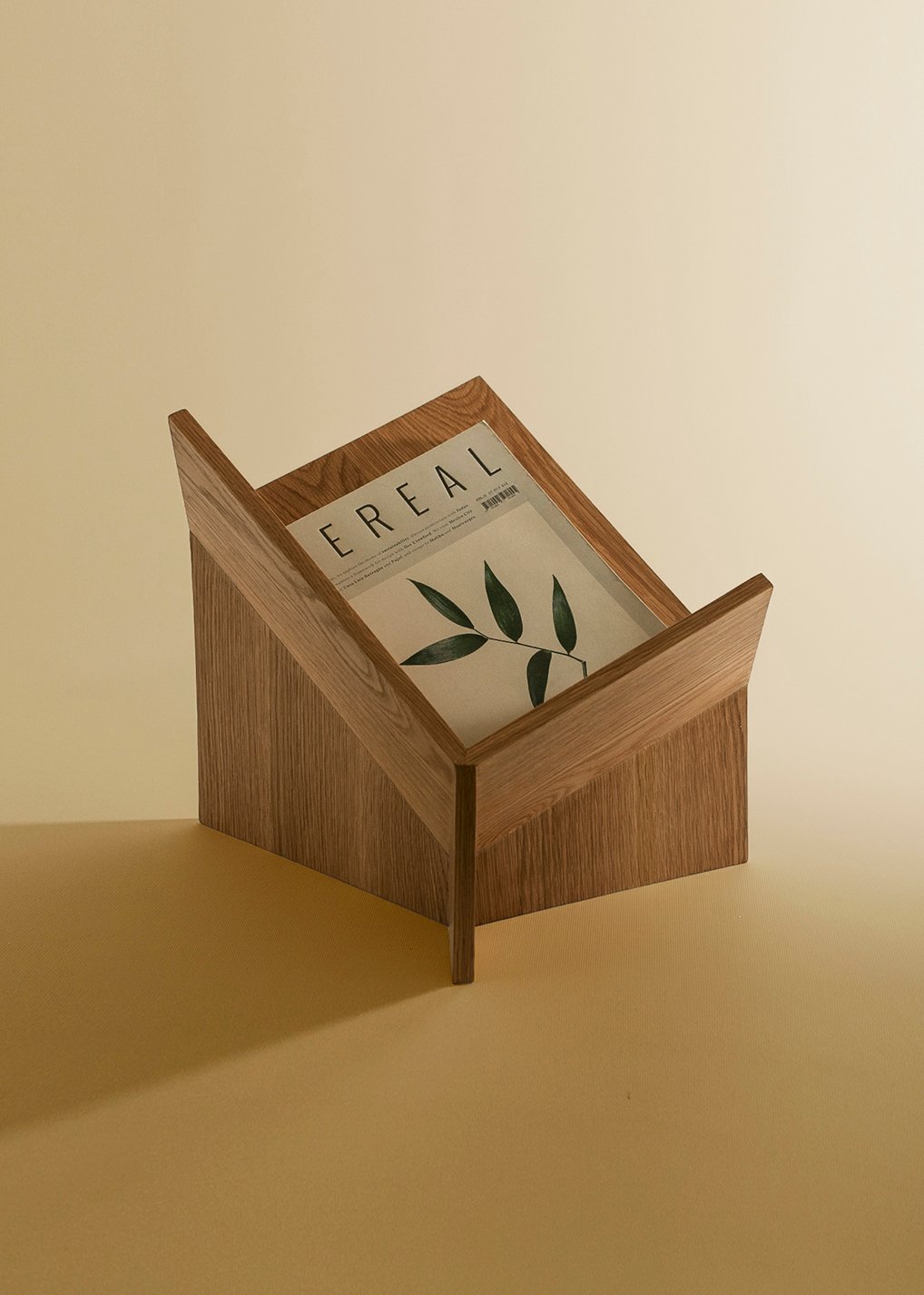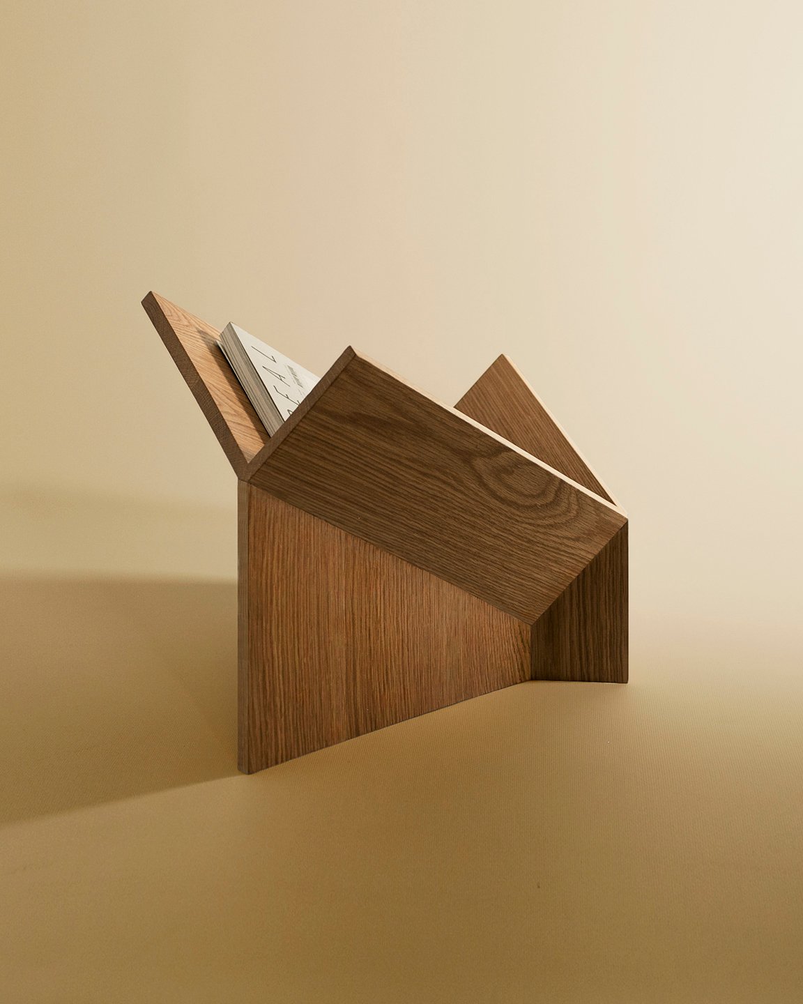 El concepto de diseño de este revistero surge de la idea de romper con la norma y desafiar lo establecido. Al contrario de lo que suele pasar, las superficies donde reposarán los libros y revistas no están alineadas con ninguno de los tres planos definidos por nuestros ejes cartesianos X, Y y Z, sino que están inclinadas en todas las direcciones mediante dos simples rotaciones.