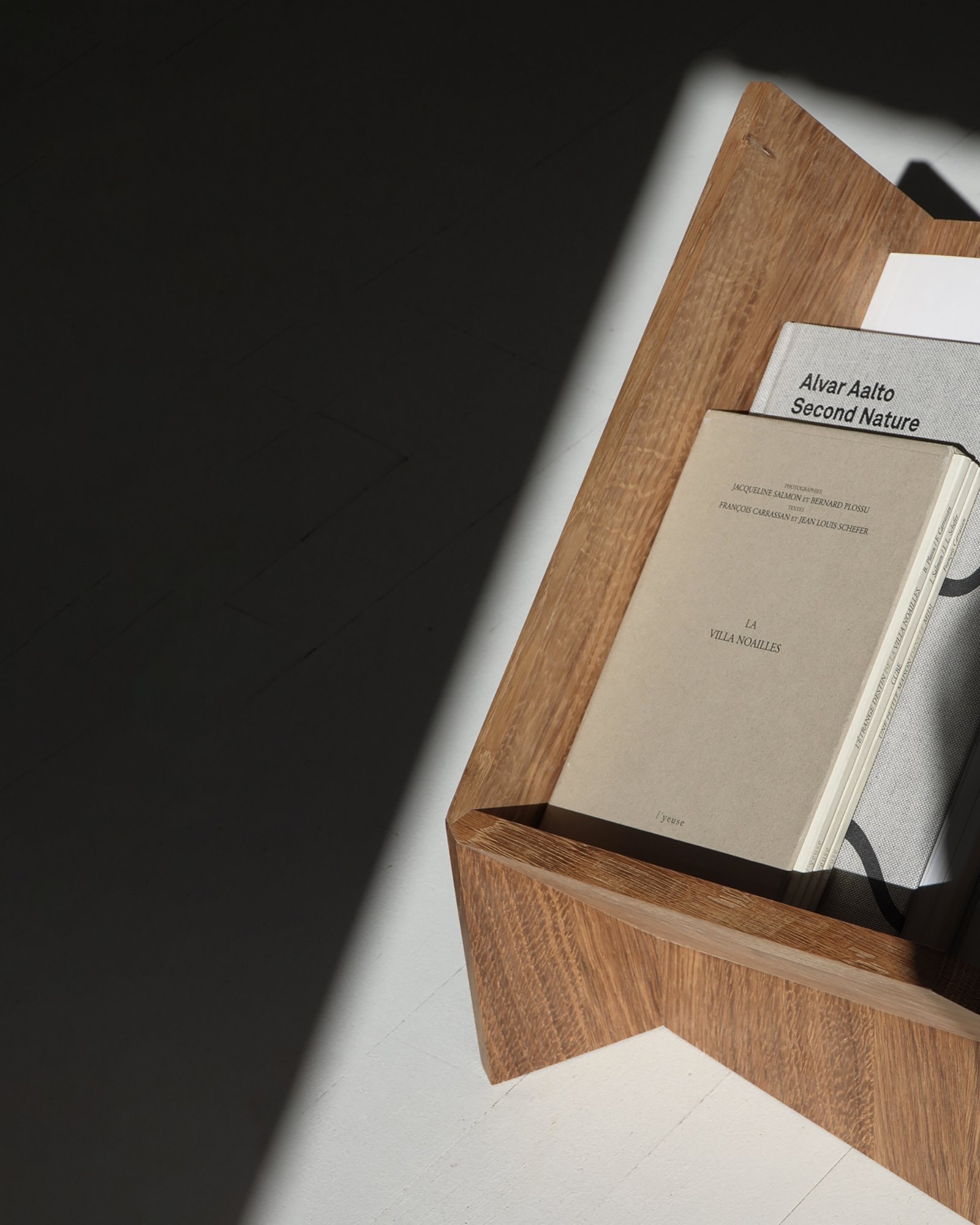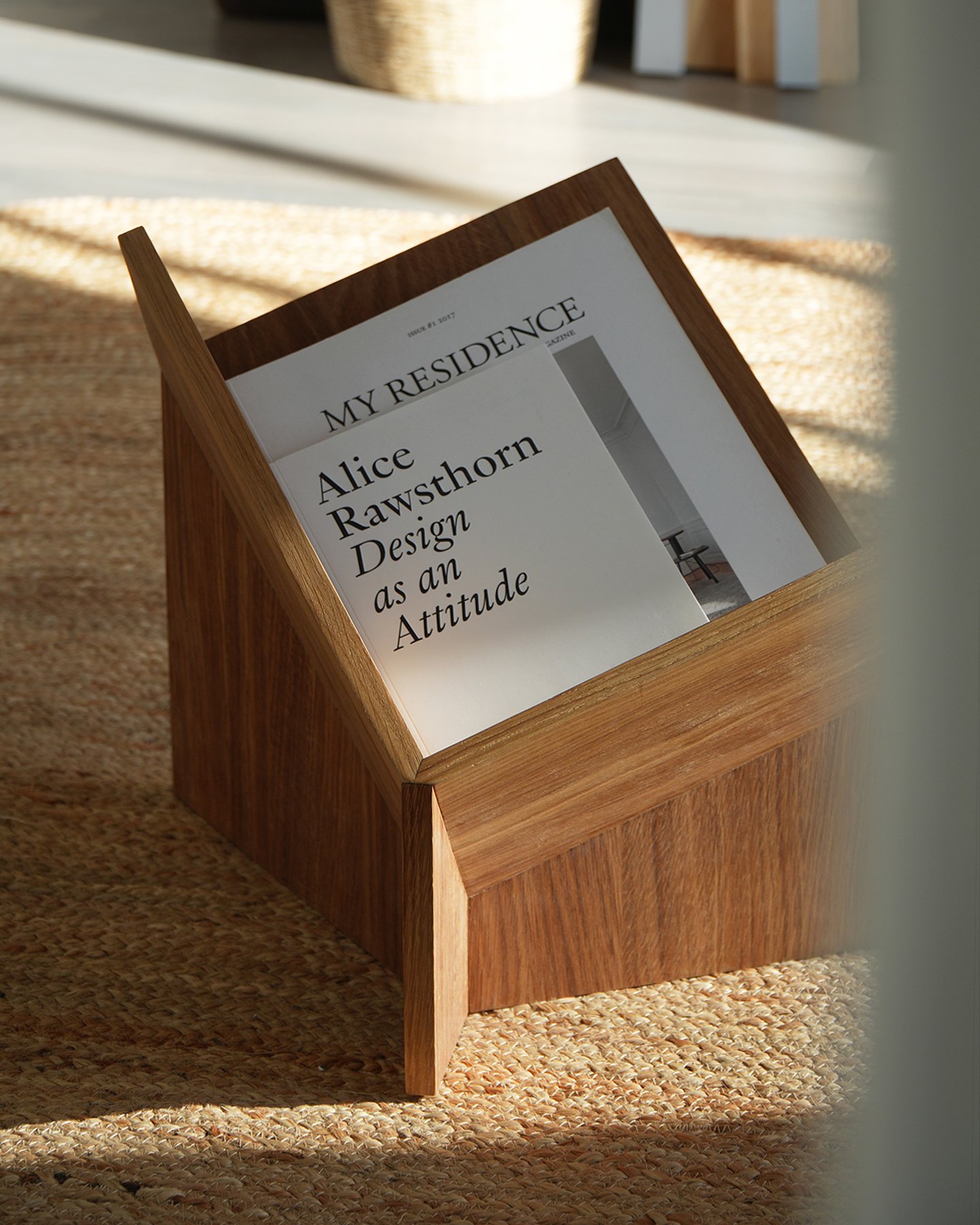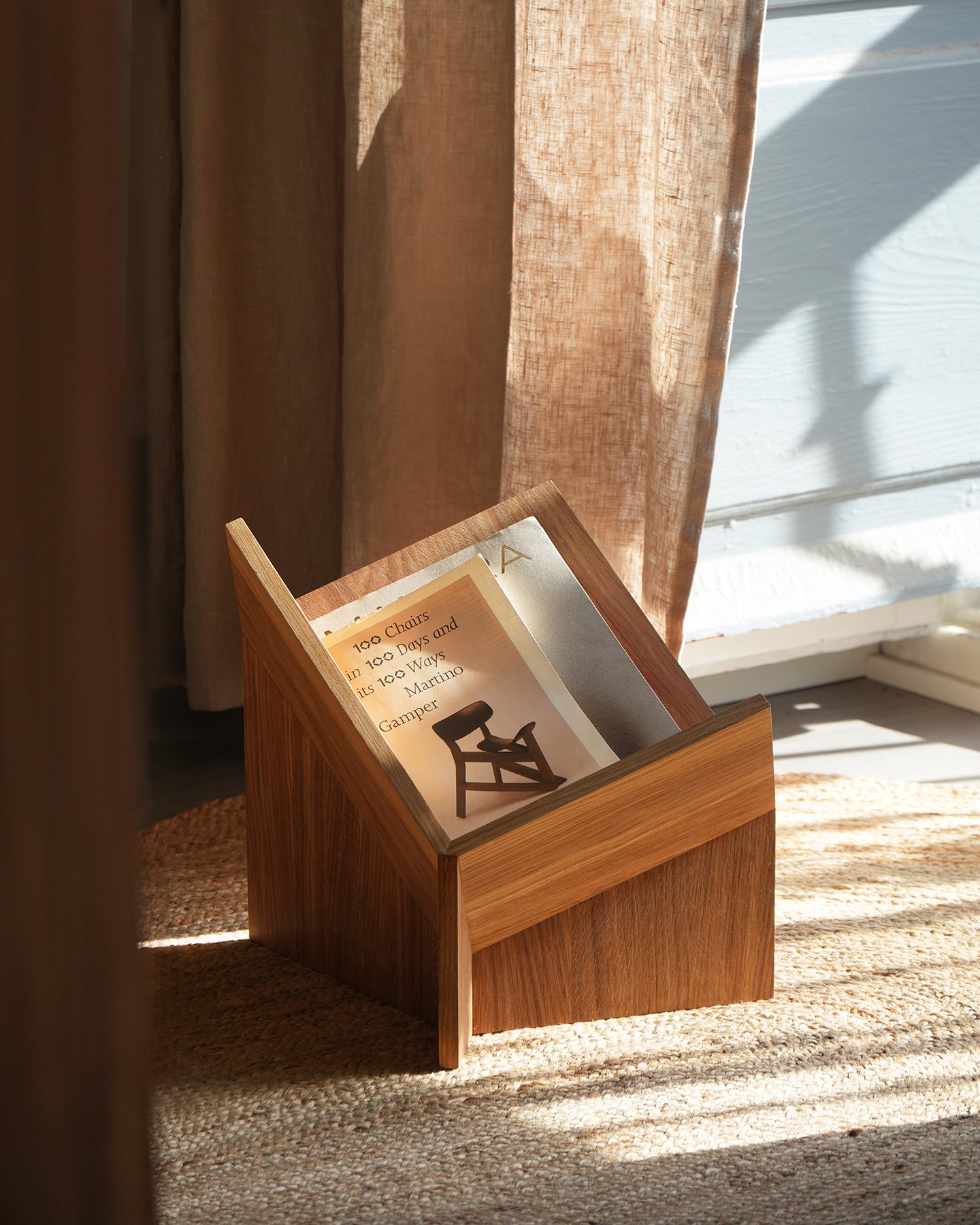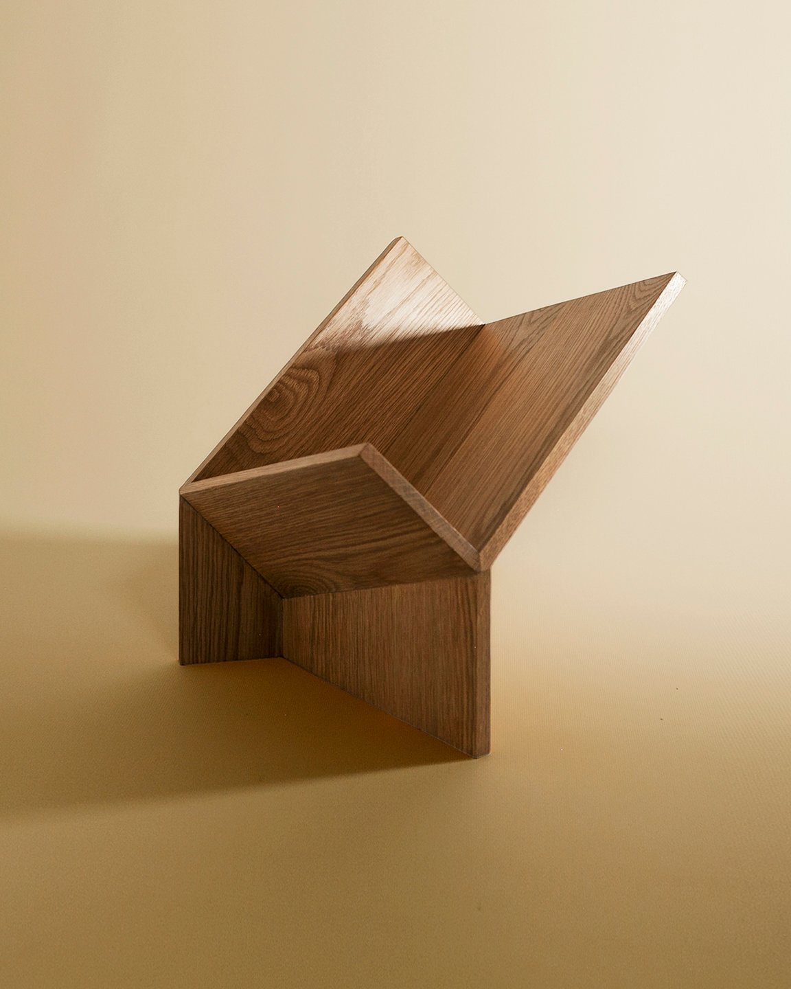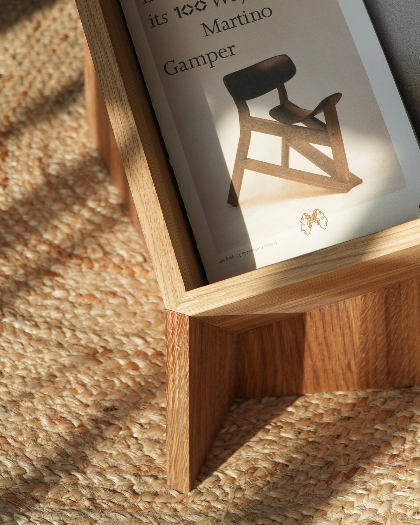 El concepto de diseño de este revistero surge de la idea de romper con la norma y desafiar lo establecido. Al contrario de lo que suele pasar, las superficies donde reposarán los libros y revistas no están alineadas con ninguno de los tres planos definidos por nuestros ejes cartesianos X, Y y Z, sino que están inclinadas en todas las direcciones mediante dos simples rotaciones.